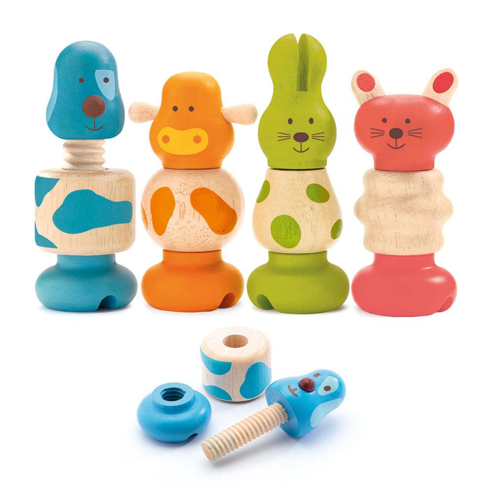 4 animaux en bois à visser et dévisser pour développer la dextérité des petits.