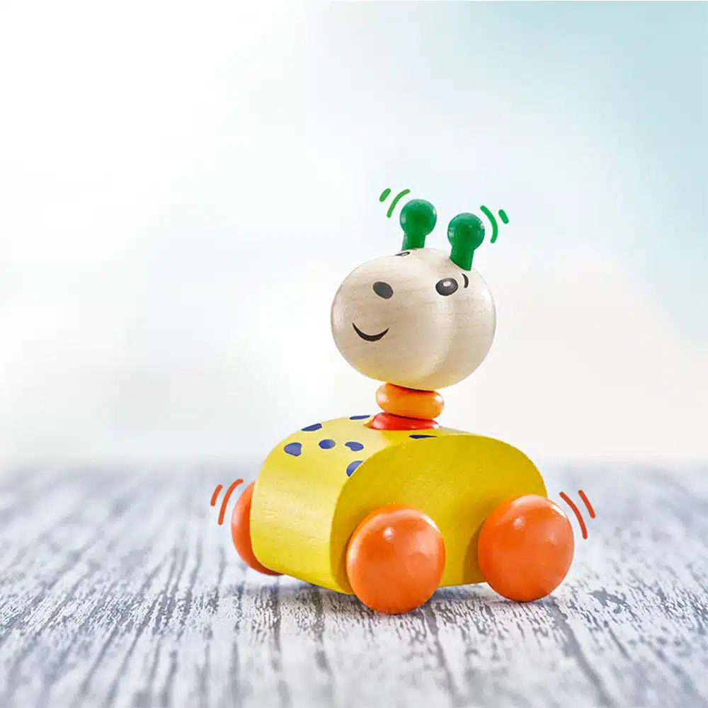 Hochet en bois couineur, à faire rouler, en forme de girafe, fabriqué en Allemagne par Selecta. À partir de 6 mois.