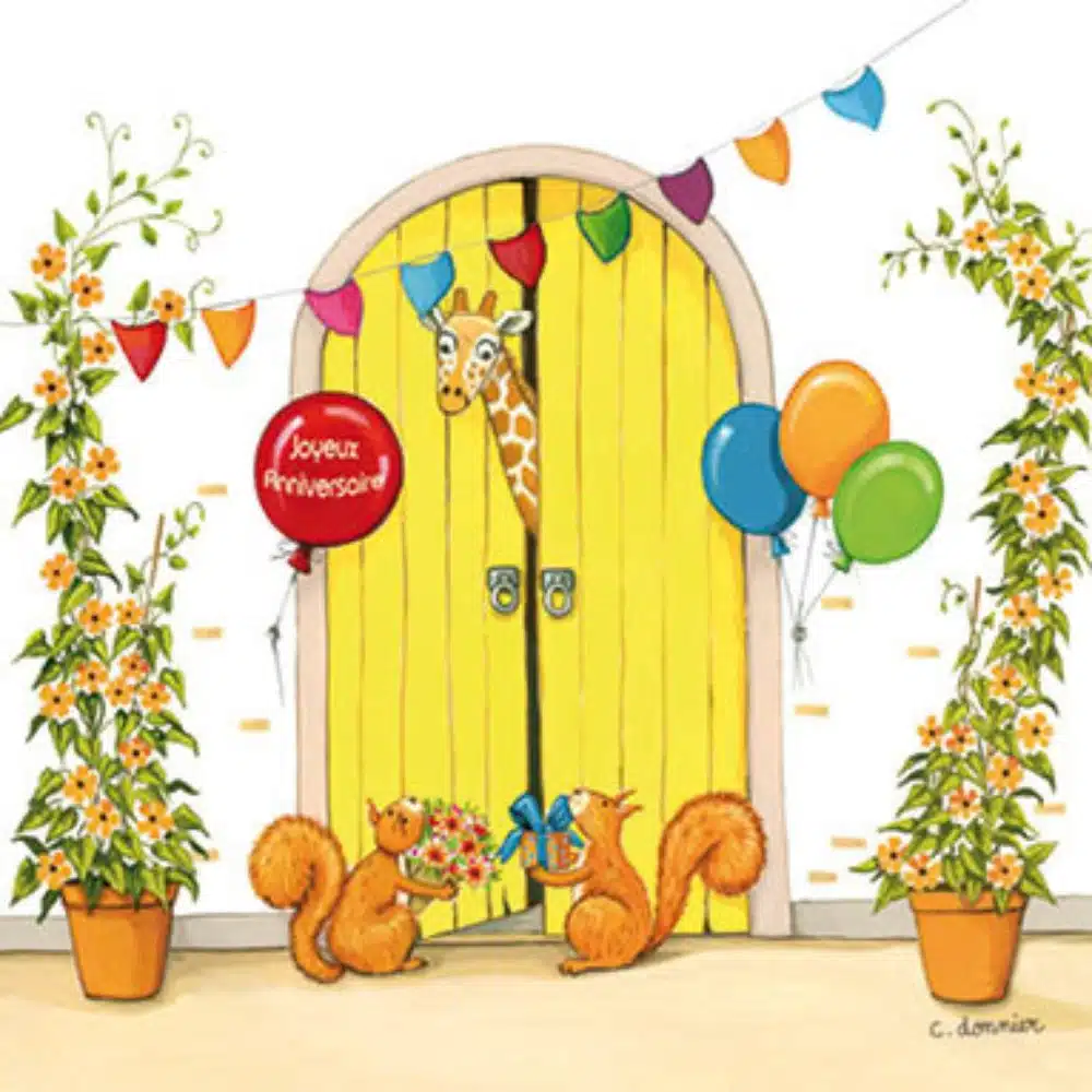 Carte d’anniversaire carrée 13,5 cm x 13,5 cm, fabrication française avec vernis sélectif. Illustratrice Christine Donnier, éditions Titi Pinson.