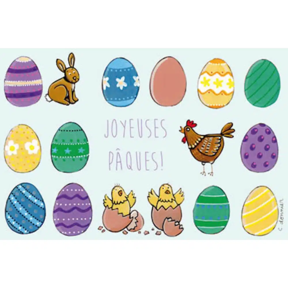 Carte postale joyeuses Pâques, rectangulaire 10 cm x 15 cm, fabrication française. Illustratrice Christine Donnier, éditions Titi Pinson.
