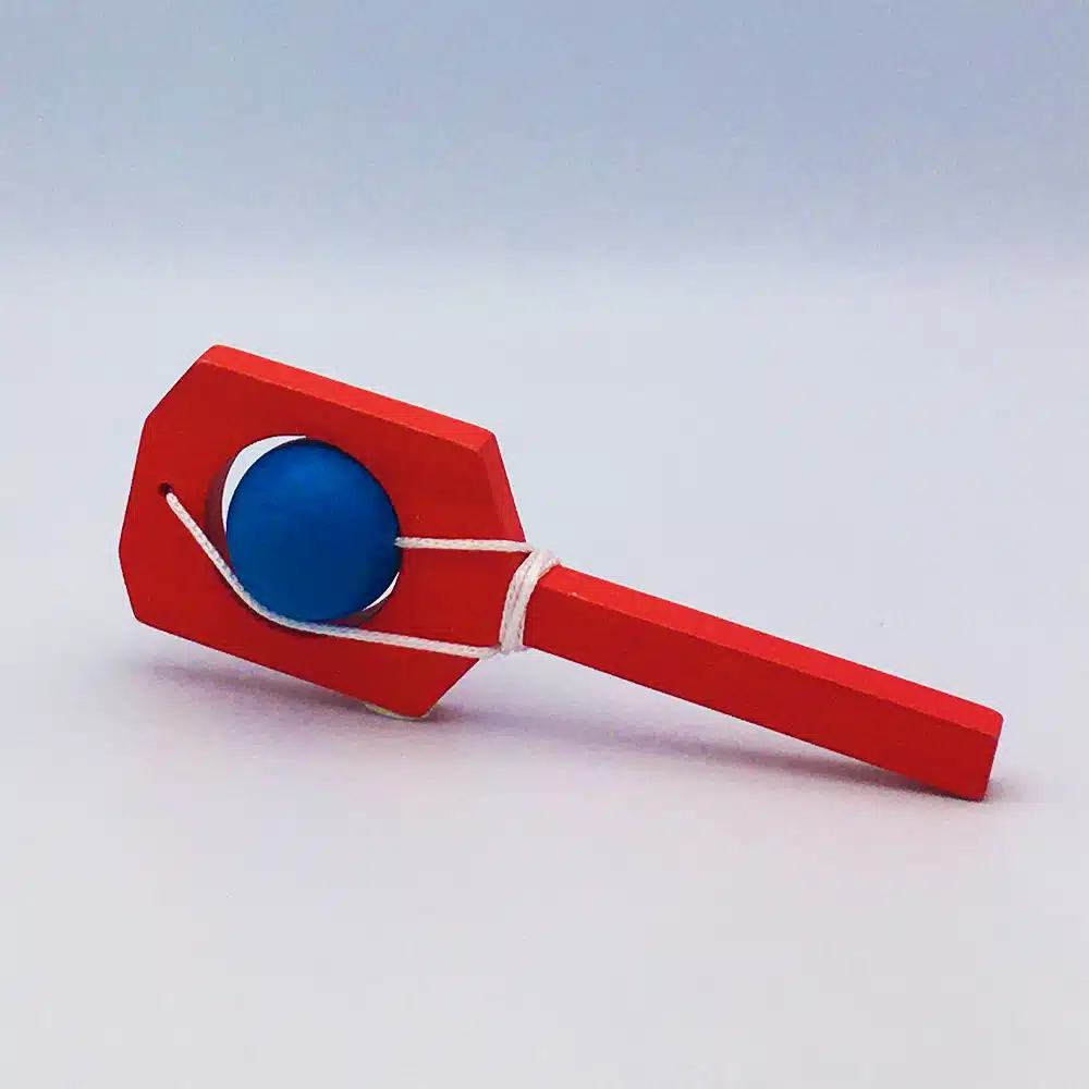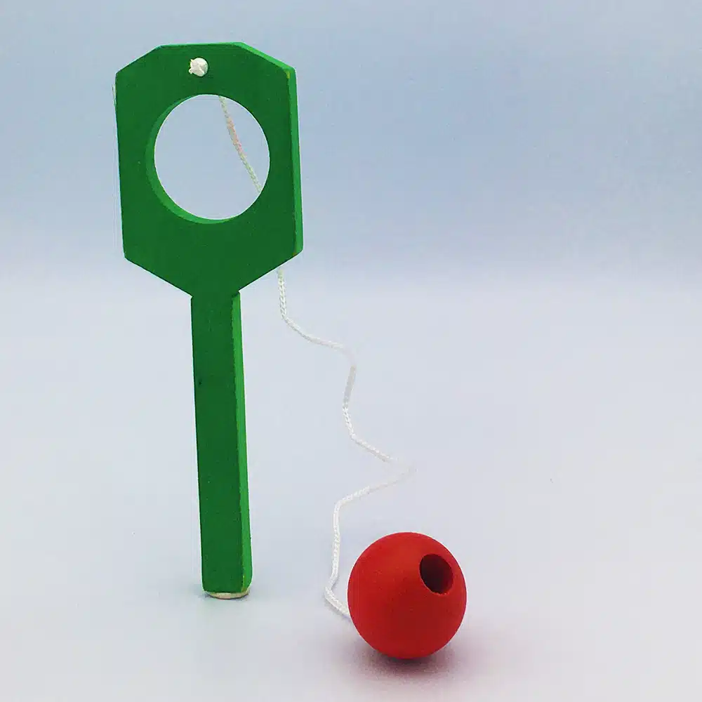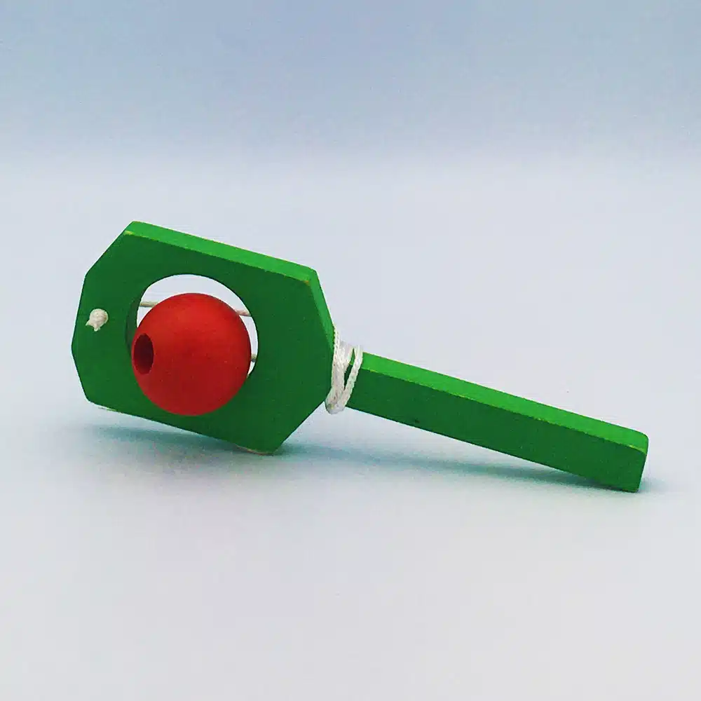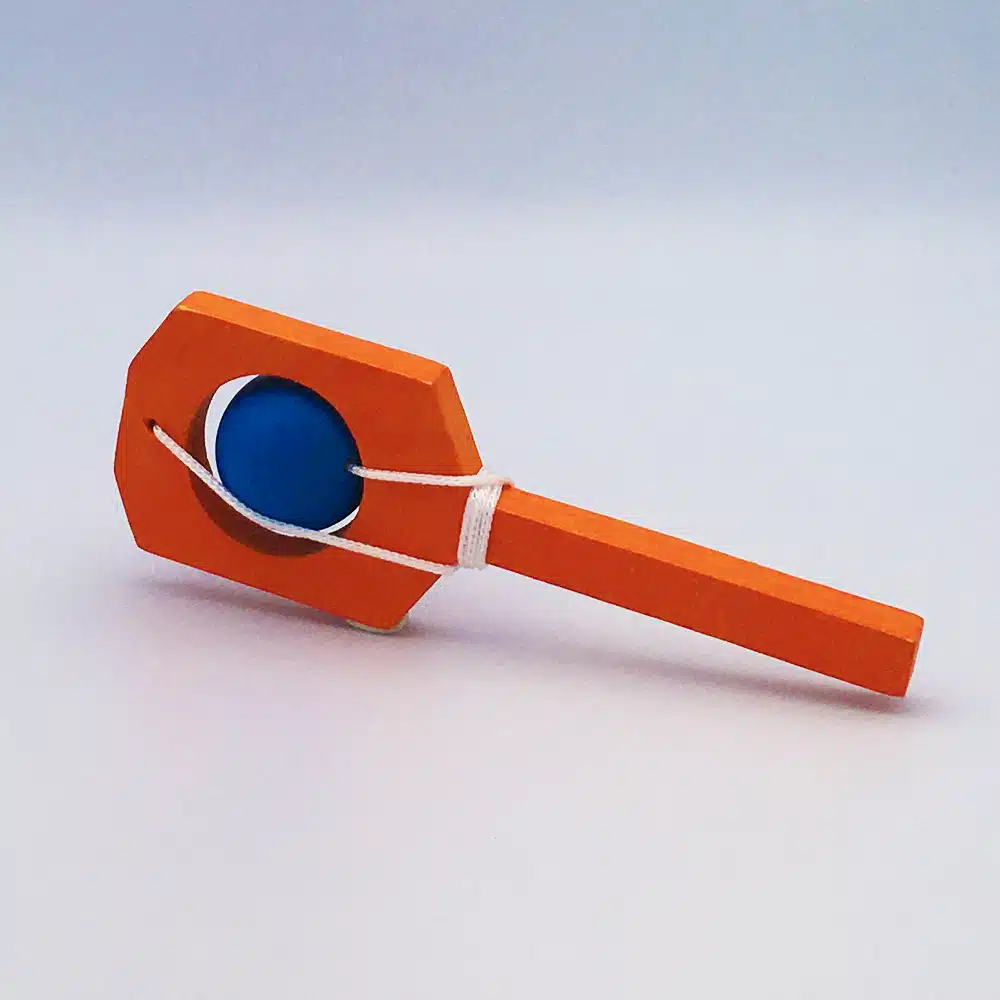 Jouet en bois en forme de petite raquette, le but étant de passer la boule dans le trou dans un sens puis dans l’autre.