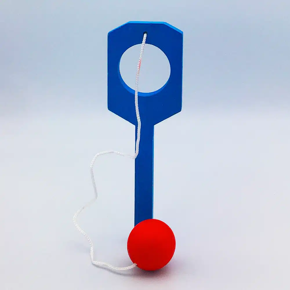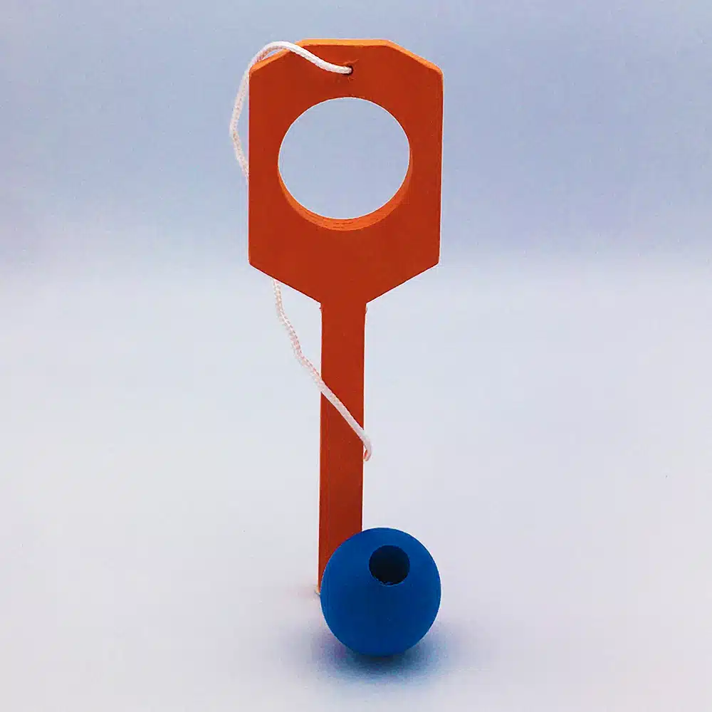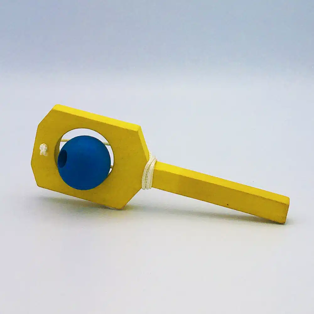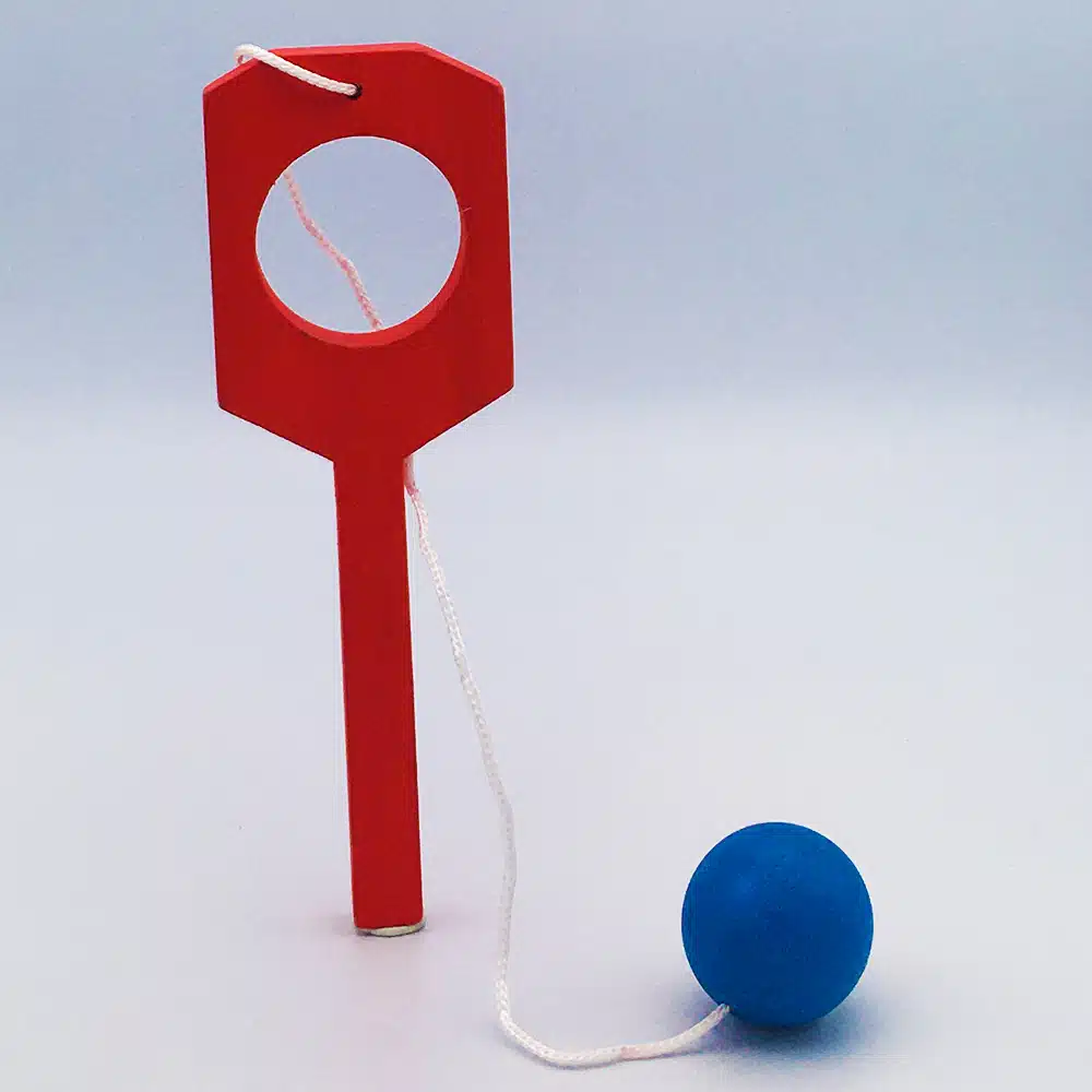 Jouet en bois en forme de petite raquette, le but étant de passer la boule dans le trou dans un sens puis dans l’autre.
