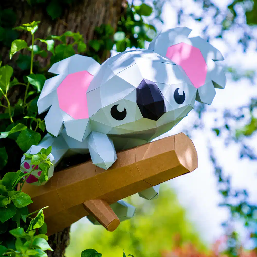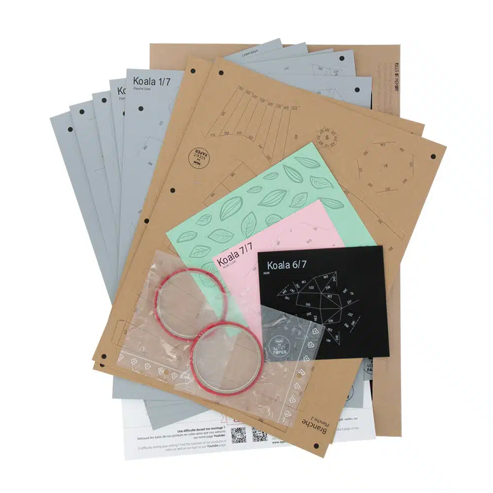 Kit de décoration murale en papier 100% recyclé fabriqué en France. Le kit comprend des planches de pièces pré-découpées, une notice et du scotch double face, tout y est pour construire ce mignon koala.