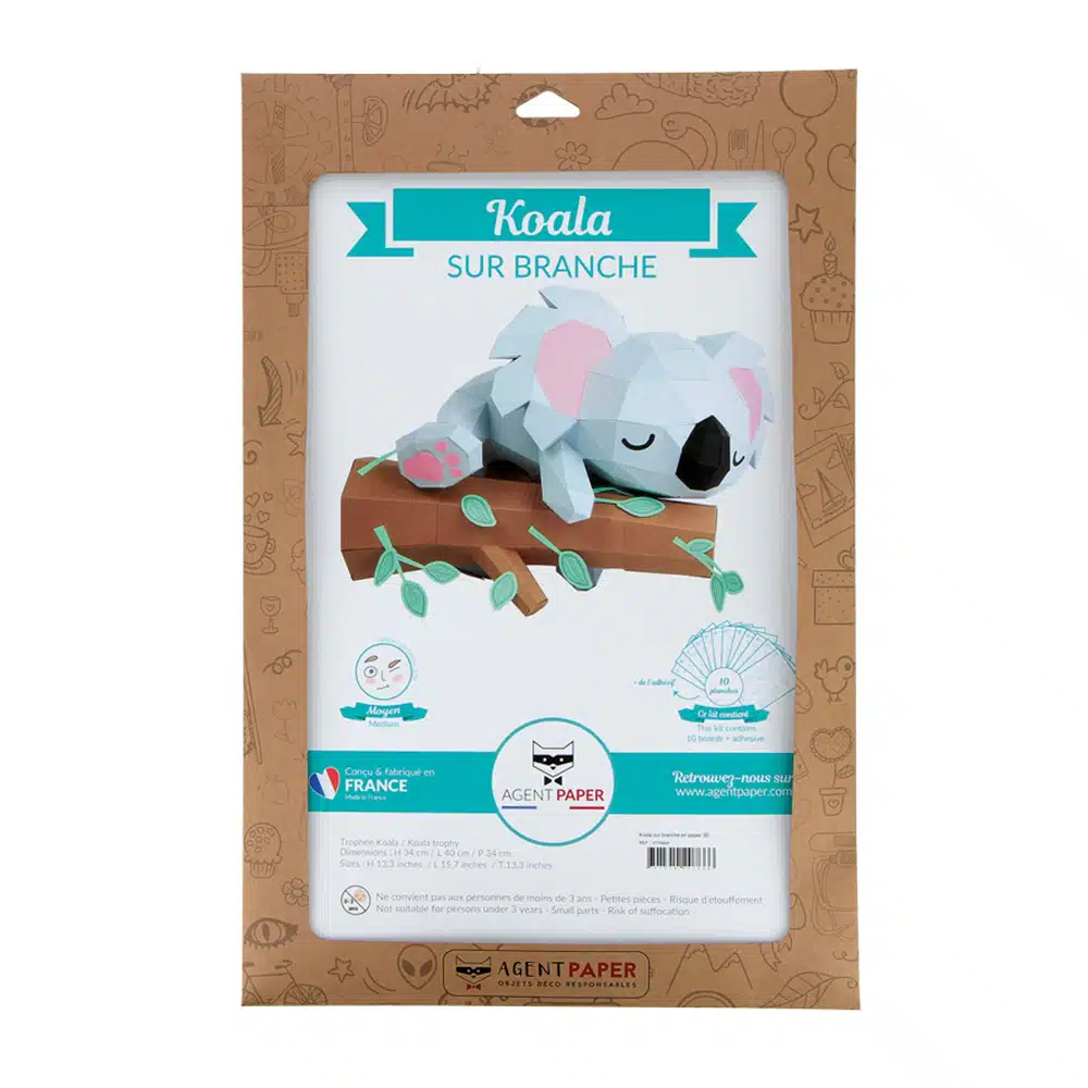 Trophée en papier 3D Koala sur branche, décoration murale originale 100% fabrication française et éco-responsable de la marque Agent-Paper, à monter soi-même niveau moyen.