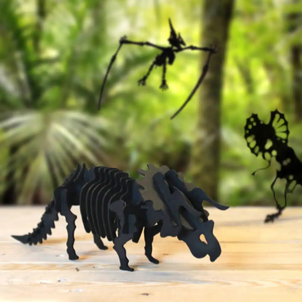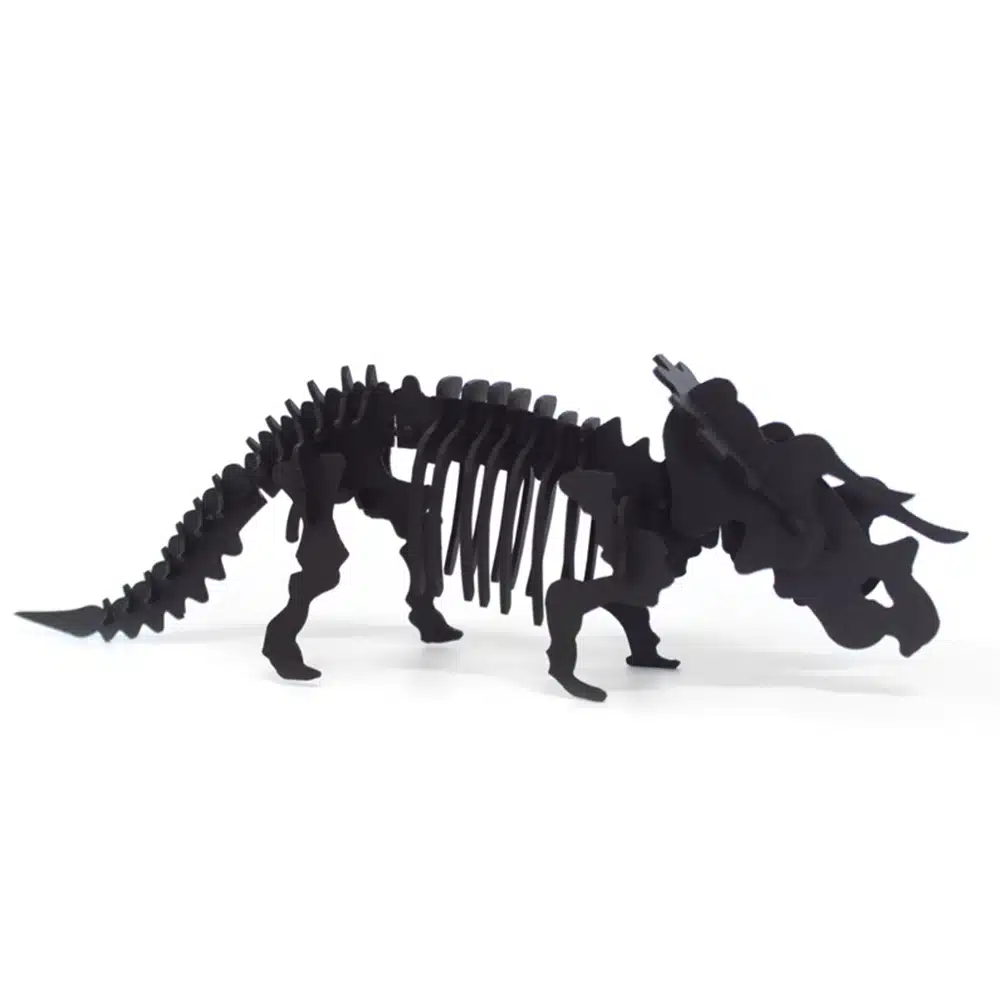 Ce tricératops en carton noir fera tout son effet posé sur une étagère dans une chambre d’enfant ou dans le salon.