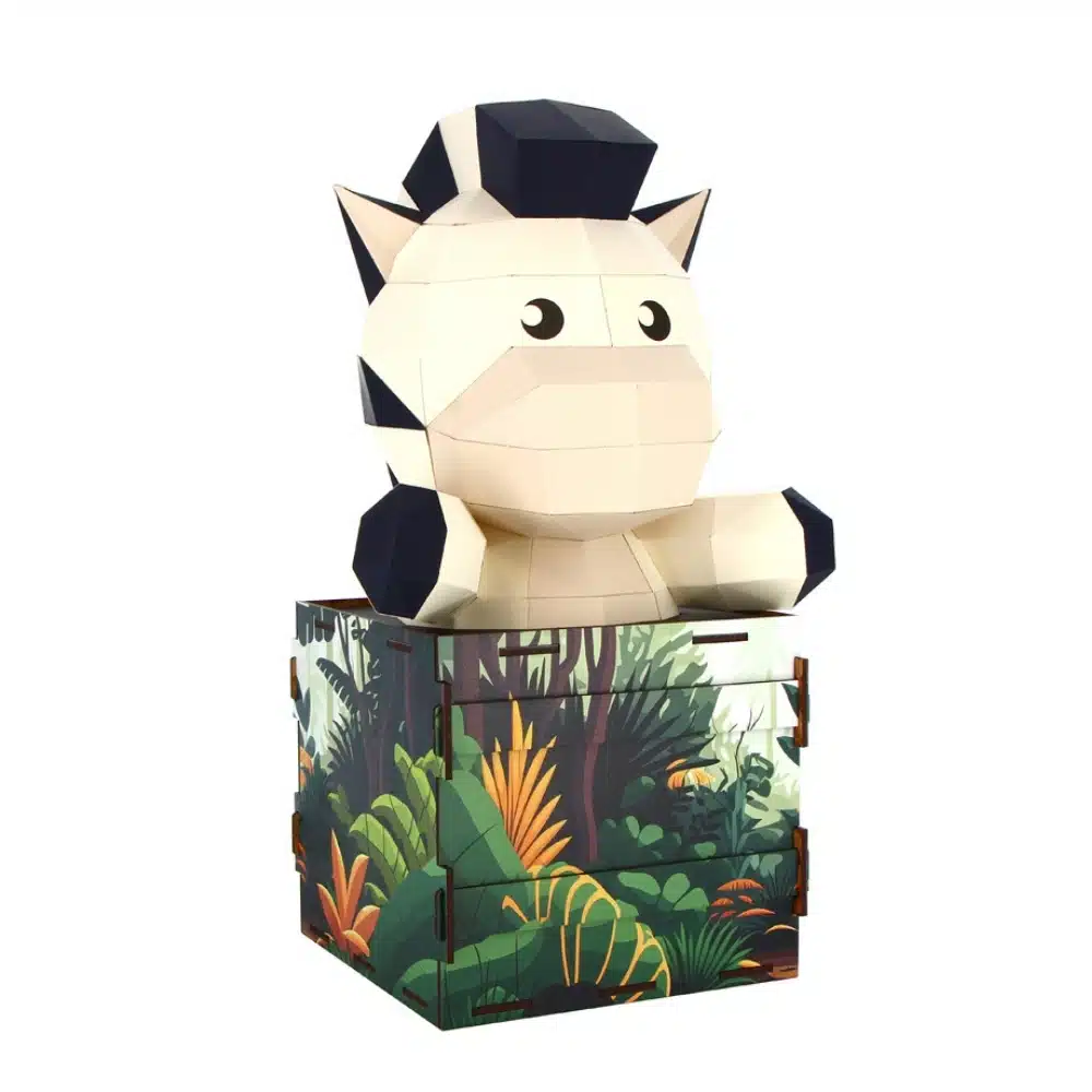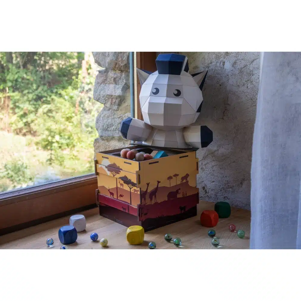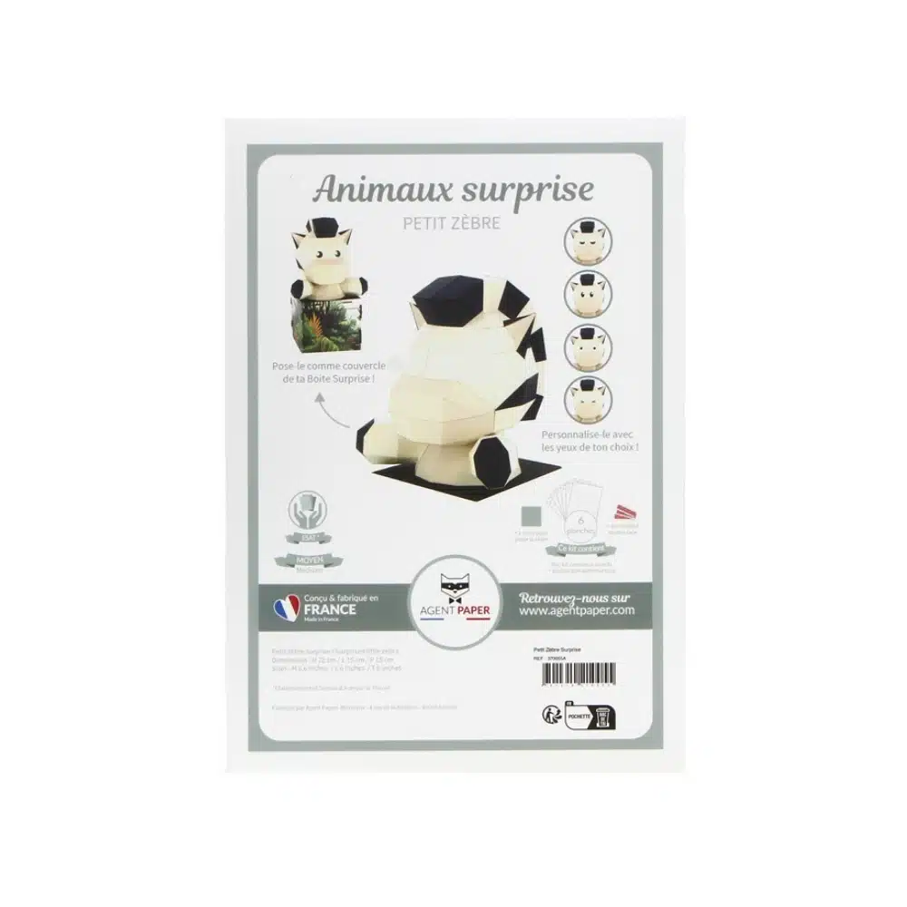 Kit de décoration à poser en papier 100% recyclé fabriqué en France. Le kit comprend des planches de pièces pré-découpées, une notice et du scotch double face, tout y est pour construire ce joli petit zèbre. Il peut être posé sur une étagère tel quel ou servir de couvercle pour une boîte surprise.